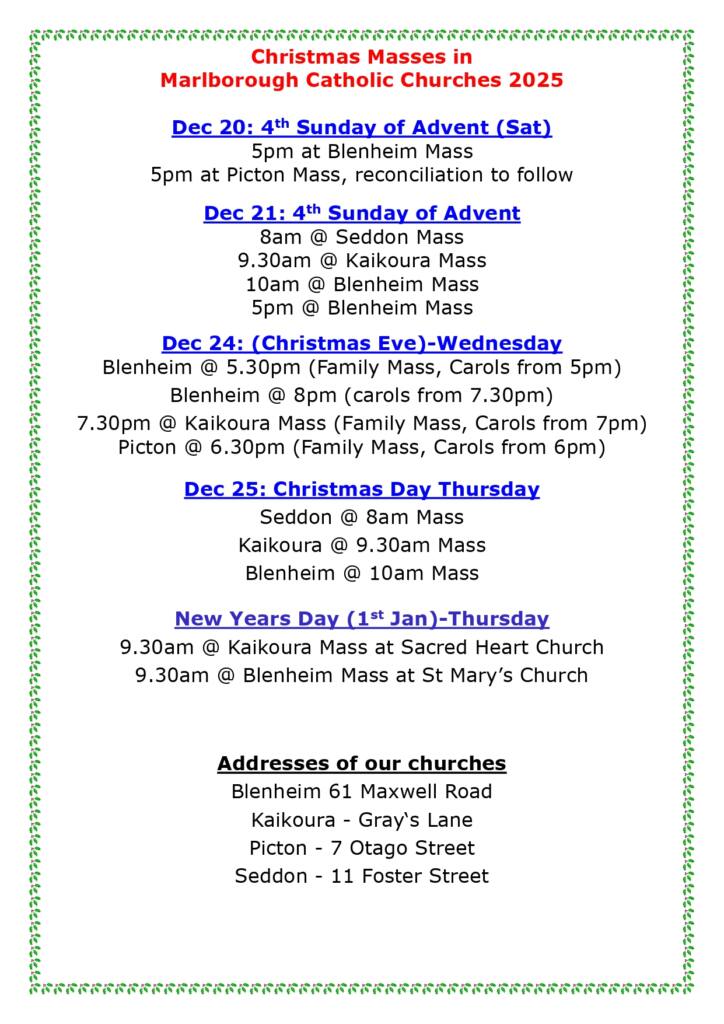 - 9:00pm Christmas Eve Mass – with Carols starting at 8:30 pm.