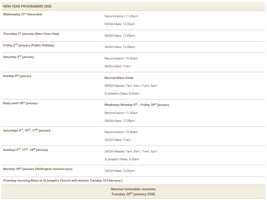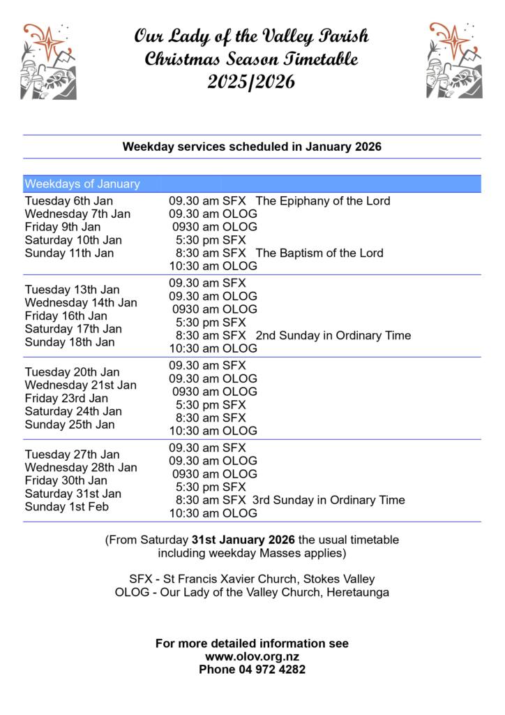 | Throughout January 2026 | No Mass on Mondays. 9.00am: Holy Mass. (No Exposition) |