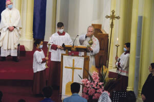 Mons Gerard Burns, Vicar General Archdiocese, swung the censer with burning incense before giving the first reading in the Liturgy of the Word