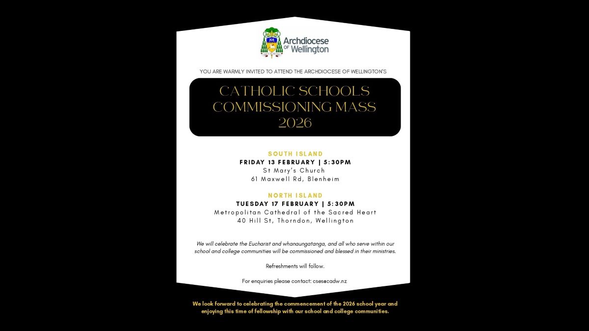 Sacred Heart Cathedral WellingtonThe North Island edition of the 2026 Catholic Schools Commissioning Mass is coming up - and you're invited!
